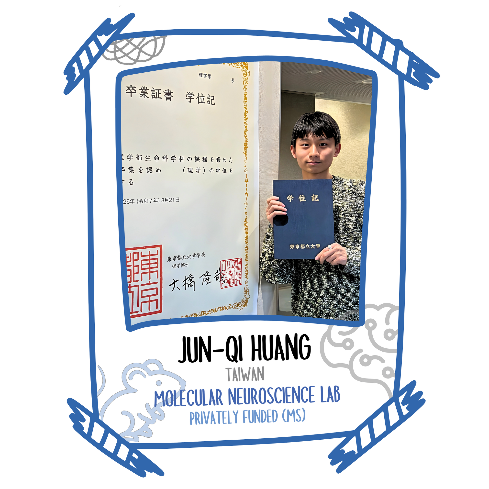 "I highly recommend prospective students to do their graduate program at TMU. I think that TMU values the importance of research, which can be evident in how they support the research work of their existing laboratories. If you’re interested in pursuing research, I believe TMU offers a strong and supportive environment to help you grow in that direction." | ![]() | |